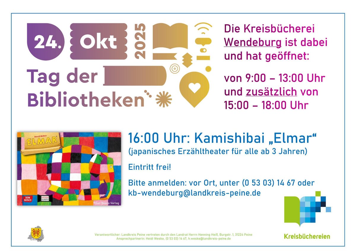 Die Kreisbücherei Wendeburg ist am 24.10.2025 zusätzlich zum Vormittag von 15 - 18 UIhr geöffnet.